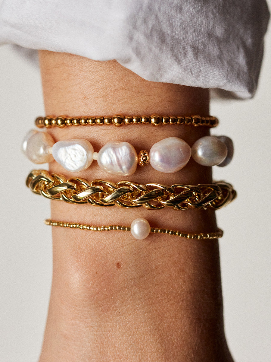 PEARLY BRACELET pairs golden beads with a single freshwater pearl — simple, elegant, and full of quiet charm. Wear it alone for a soft statement or layer it into your everyday stack.