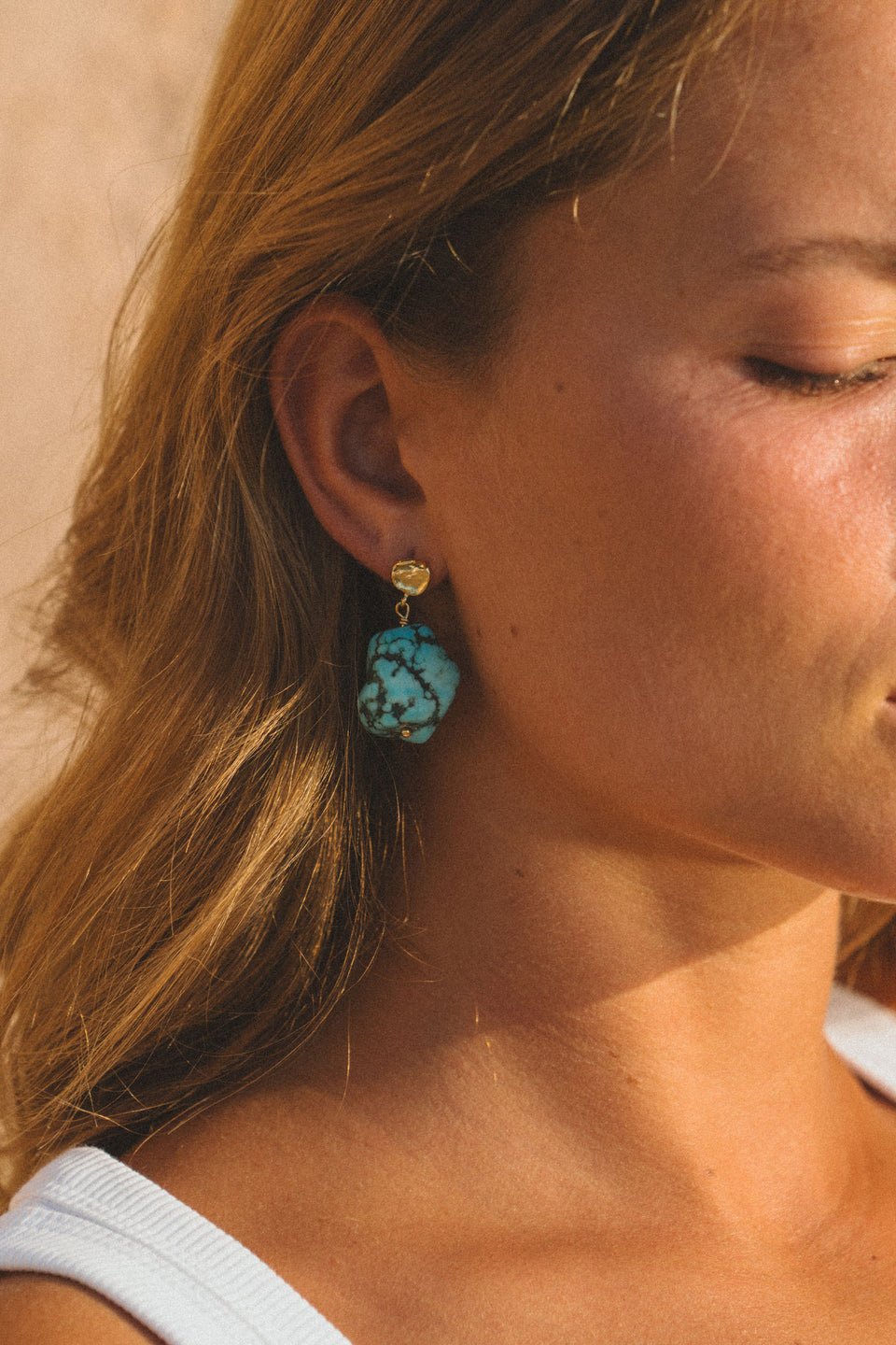 The La Mer Necklace is a bold and vibrant statement piece, featuring chunky turquoise beads and knotted traditional beadwork details. This necklace is the standout piece of the collection and a designer favorite, perfect for adding a pop of color to your summer look.