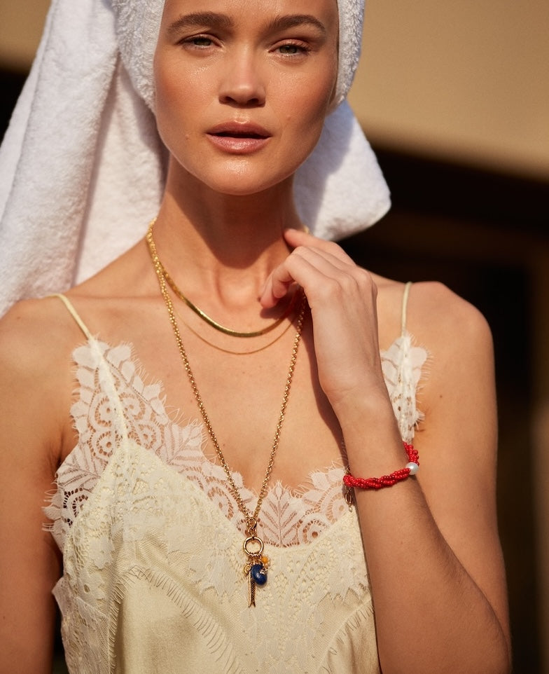 SWIMCLUB is a poolside daydream — pearls, lapis and golden details woven into playful elegance.- Crafted in brass with 18-karat gold plating and anti-tarnish e-coating